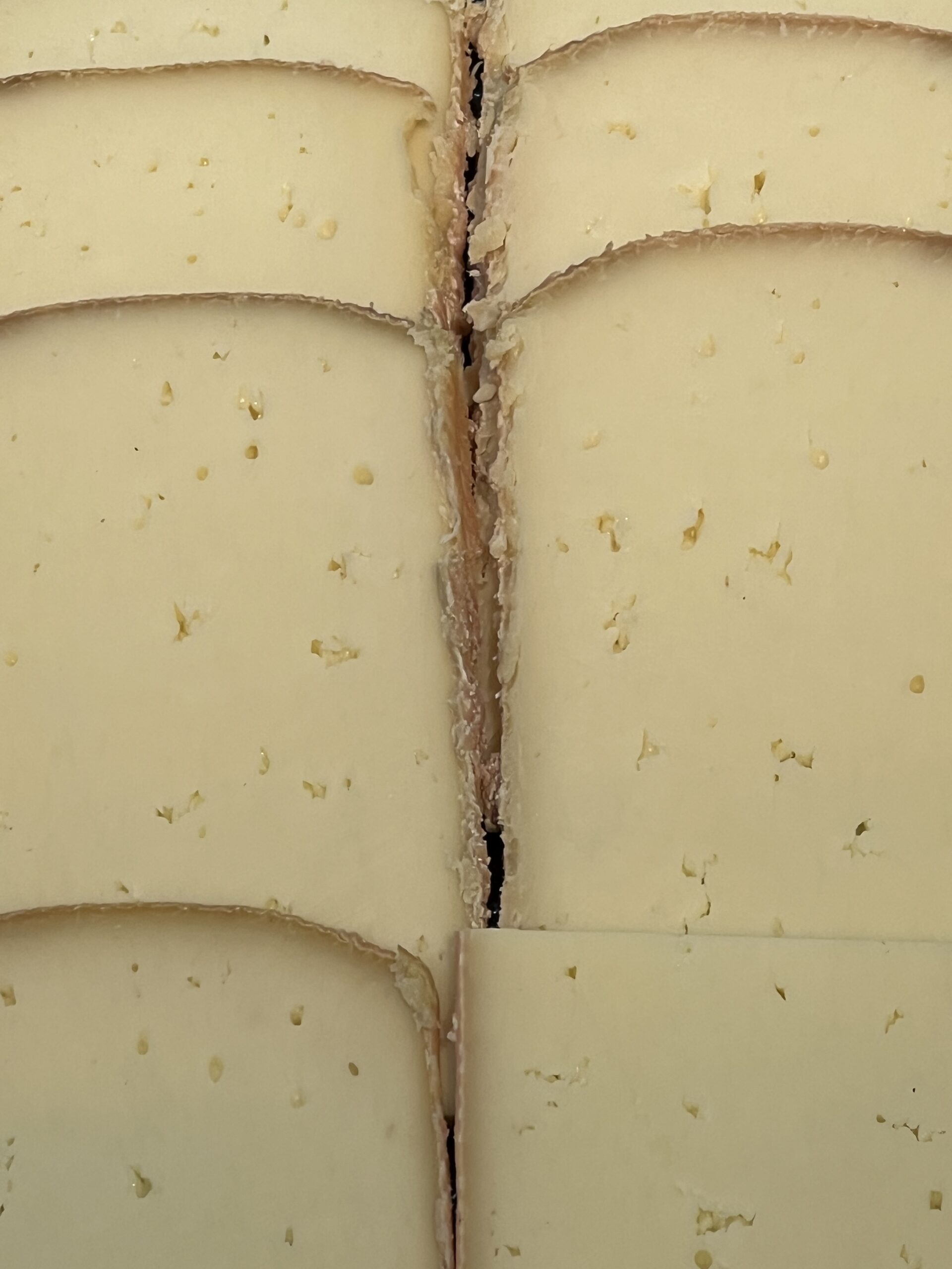 Sa pâte, de couleur blanche à jaune paille, est souple et dense à la fois et peut présenter quelques petites ouvertures.